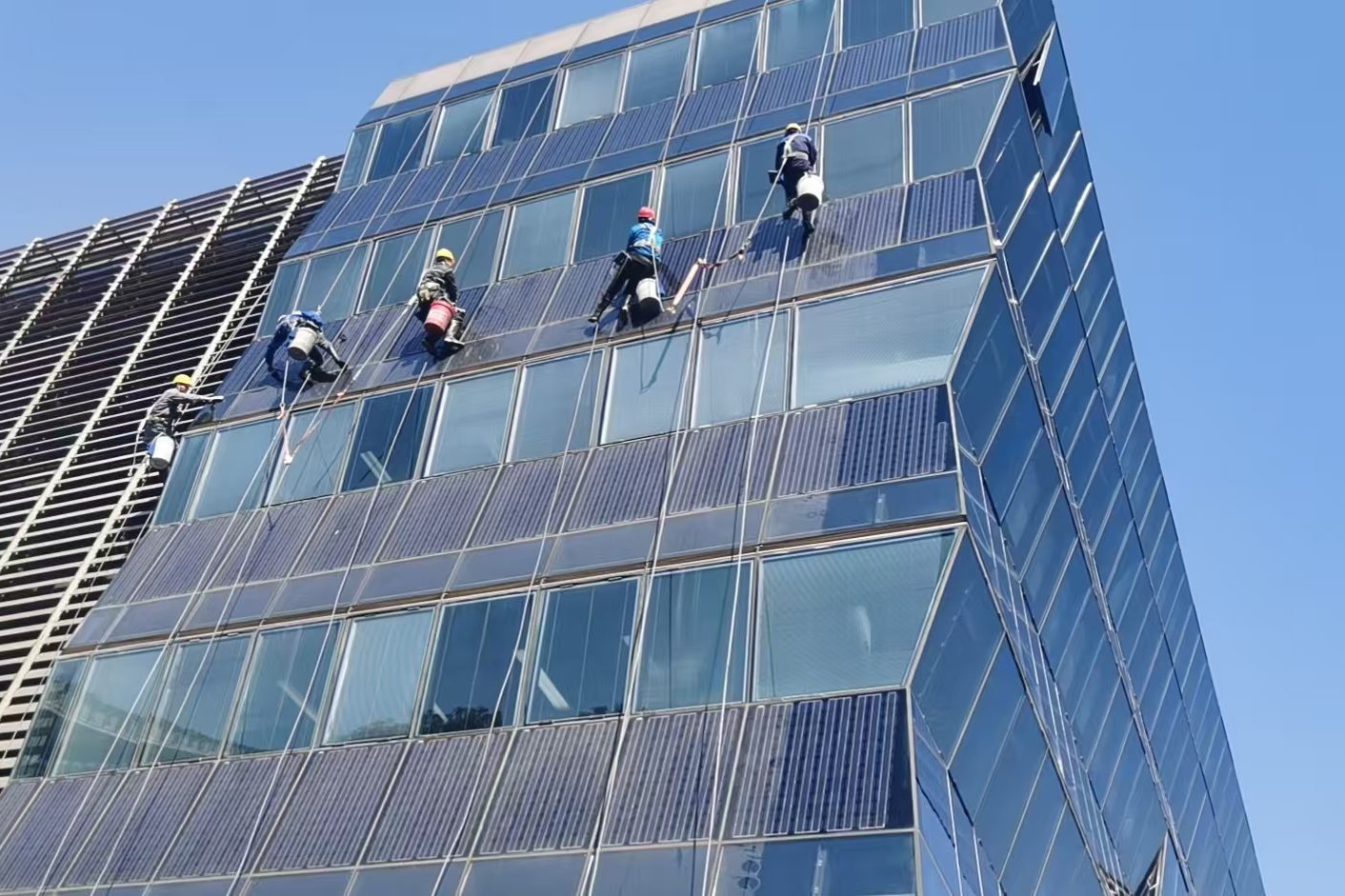 我们配备持证高空作业人员及相应的作业设备,适用于各类高层商务楼宇、大型展馆及公共设施的外墙清洁需求。在清洗幕墙表面附着污渍的同时,可协助观察外立面胶条老化、面板完好度等情况。这项业务服务于建筑外立面的日常形象维护,保持建筑外观的通透与整洁。